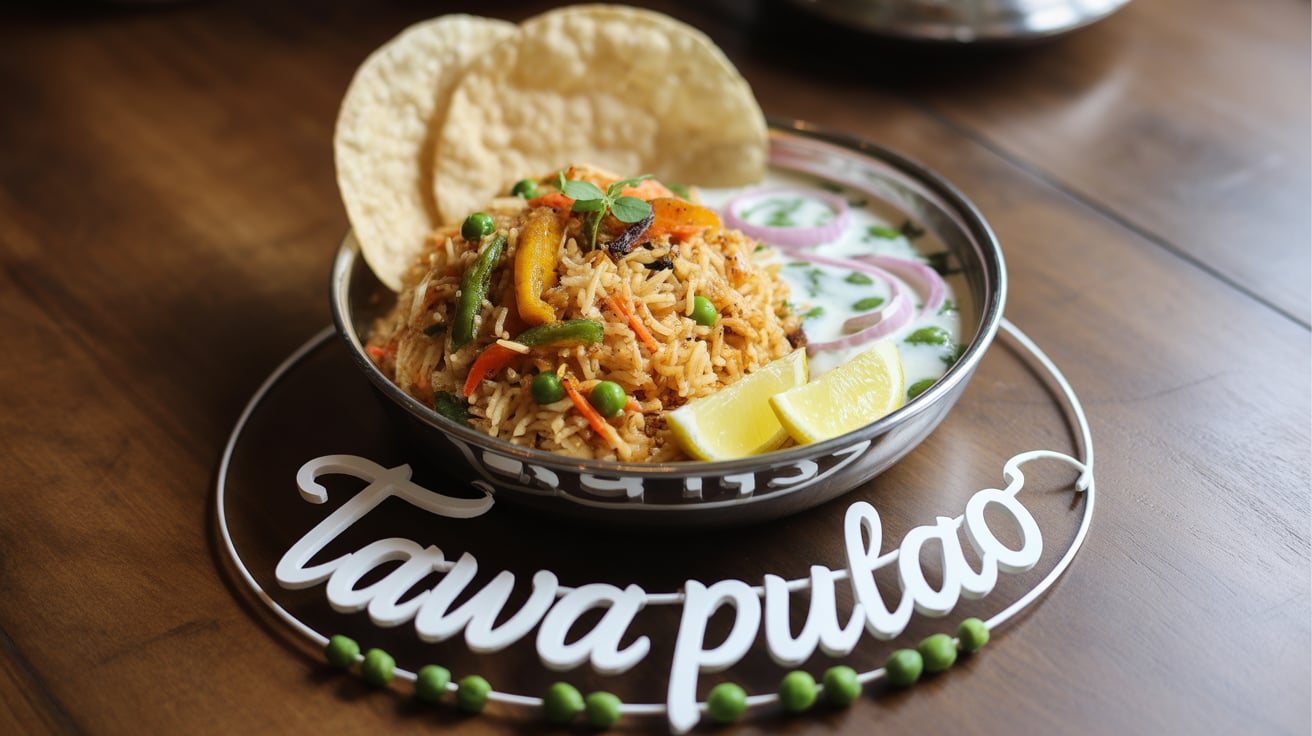 “Tawa” means flat pan, “Pulao” means flavored rice. Together — street-style rice stir-fried on a hot griddle with spices and vegetables.